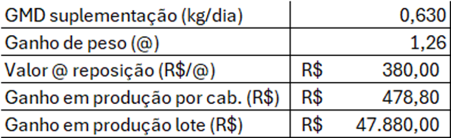 O que essa simulação revela é que o desempenho (ganho de 1.26 arrobas) paga a nutrição (custo de R$ 460). Ao final do período de suplementação antecipada, o animal está com 8.2 arrobas, pronto para o pasto, e o produtor evitou pagar um preço significativamente maior no momento de pico de demanda do mercado.